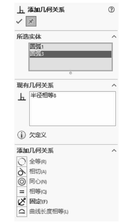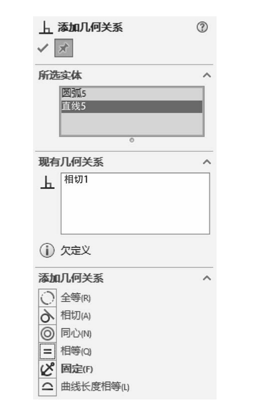 ① 单击“草图”选项卡中的“添加几何关系”按钮