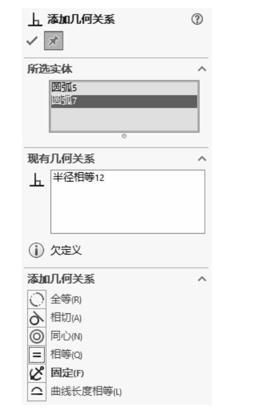 ,弹出“添加几何关系”属性管理器,如图2-114所示。选择步骤(2)中绘制的两个小圆,在属性管理器中单击“相等”按钮,使两圆相等。同理,对两个小圆弧添加相等约束,如图2-115所示。