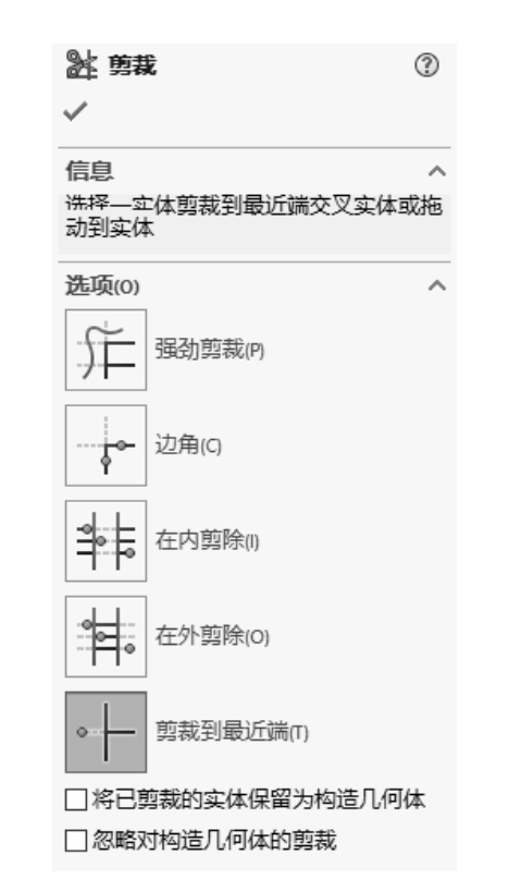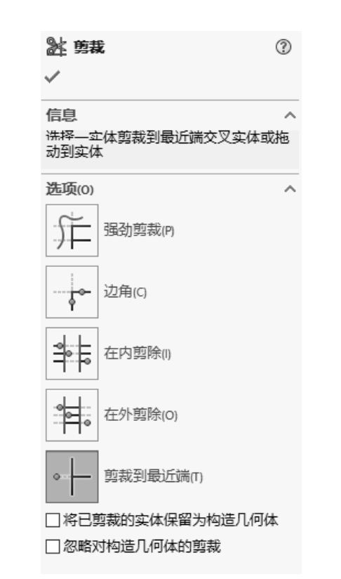 ,弹出如图2-120所示的“剪裁”属性管理器,选择“剪裁到最近端”选项,剪裁多余的线段,单击“确定”按钮