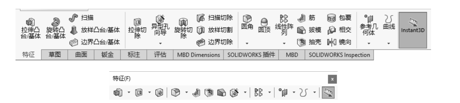 SolidWorks 提供了专用的“特征”工具栏和“特征”选项卡,如图 3-1 所示。单击选项卡上相应的按钮就可以对草体实体进行相应的操作,生成需要的特征模型。