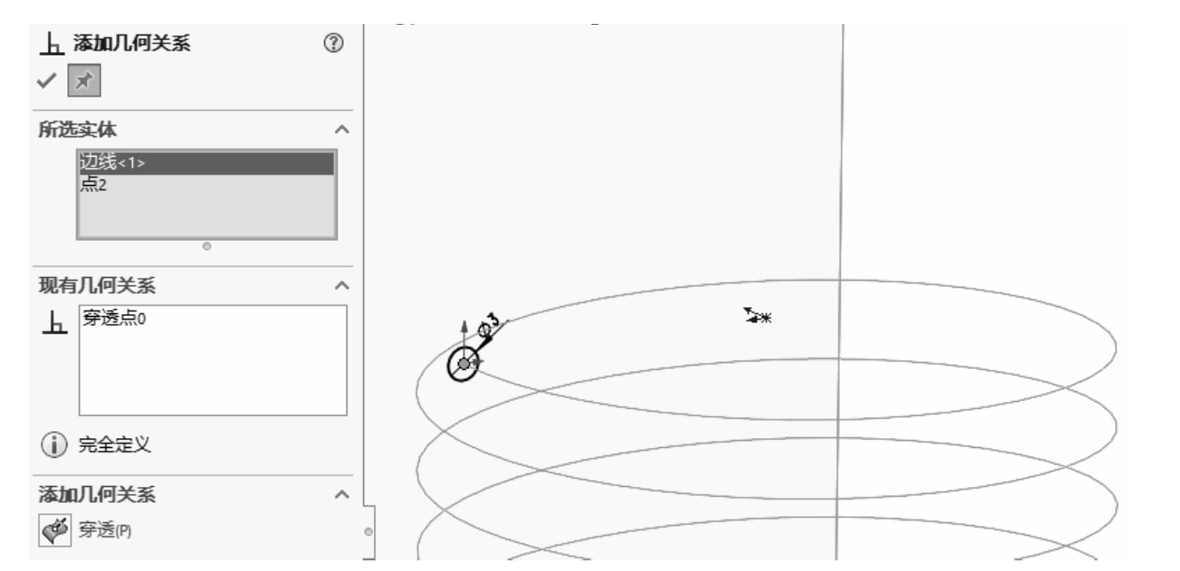 ,选择圆心和螺旋线,添加穿透几何关系,如图3-103所示,单击“确定”按钮