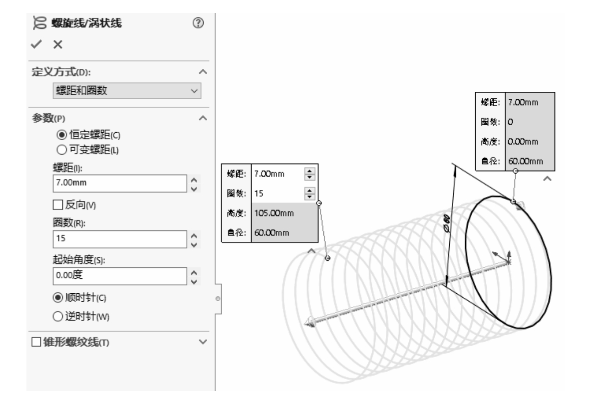 ,在弹出的“螺旋线/涡状线”属性管理器中设置“定义方式”为“螺距和圈数”,设置“圈数”为15、“螺距”为7mm、“起始角度”为0°,其他选项设置如图3-101所示,单击“确定”按钮