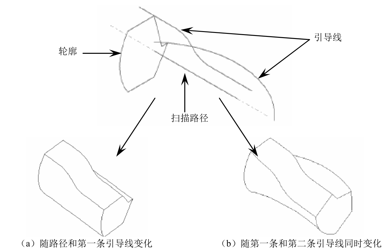 ● 随第一和第二引导线变化:如果引导线不只一条,选择该项将使扫描随第一条和第二条引导线同时变化,如图3-97(b)所示。