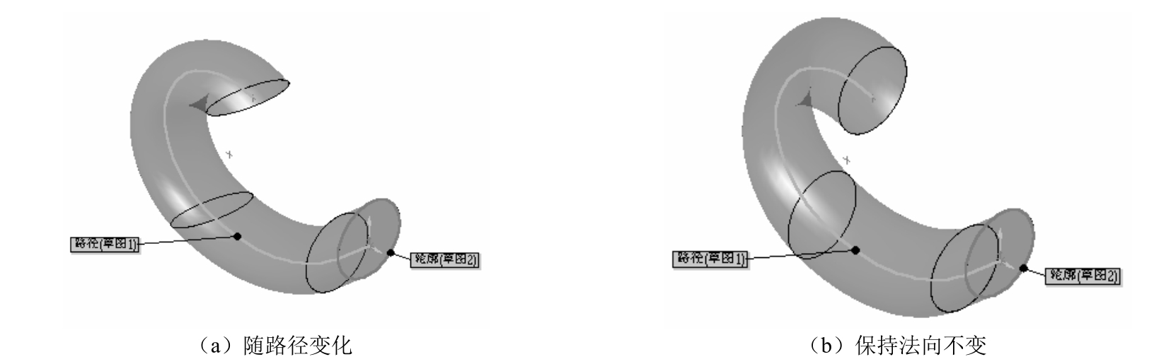 ● 随路径变化:草图轮廓方向随路径的变化而变化,其法线与路径相切,如图3-91(a)所示。