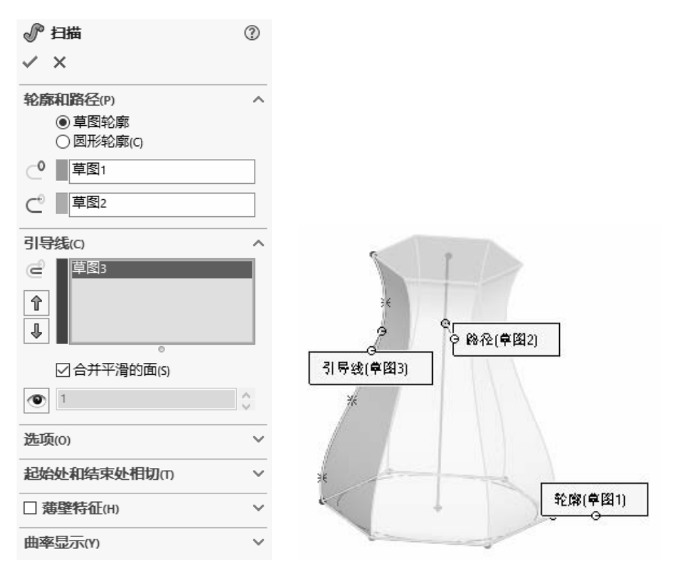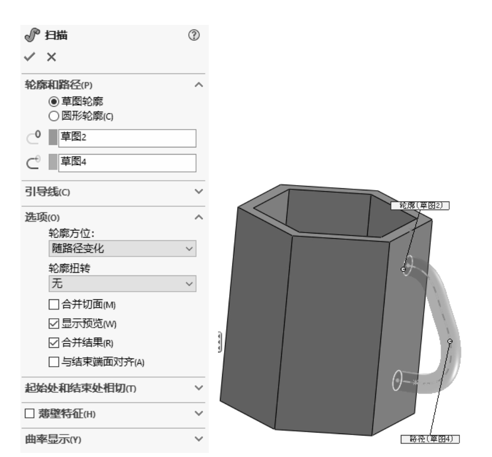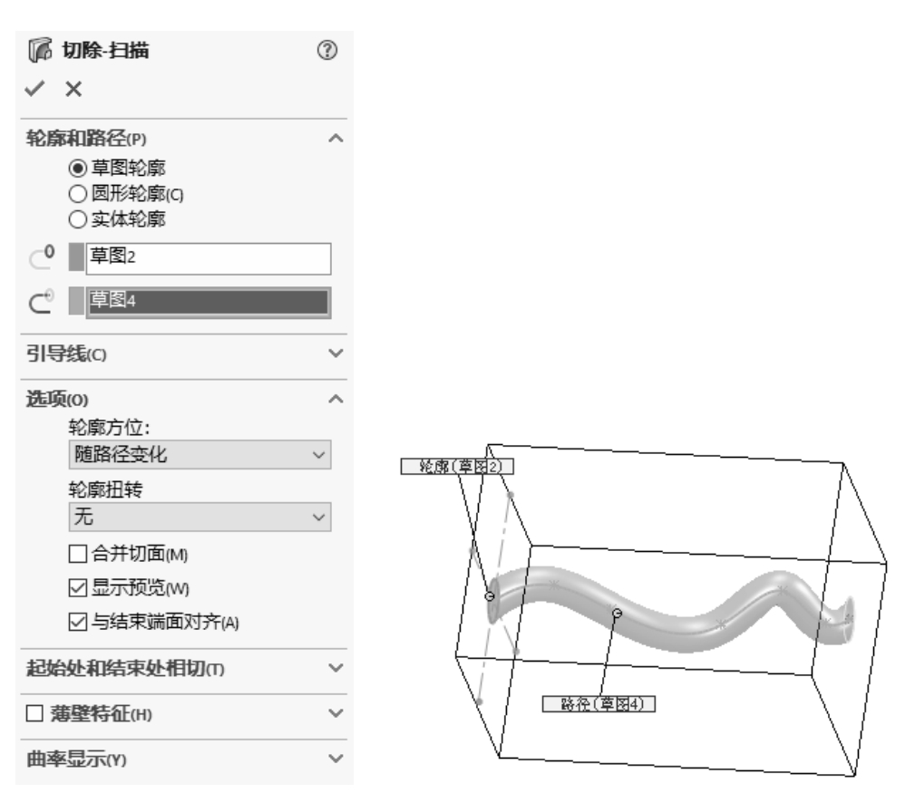 ,然后在图形区中选择路径草图。如果预先选择了轮廓草图或路径草图,则草图将显示在对应的属性管理器文本框中。