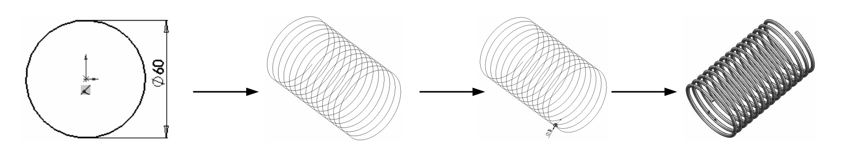 本例利用扫描特征来制作一个弹簧。扫描特征是指由二维草图平面沿一个平面或一条空间轨迹线扫描而成的一类特征。通过沿着一条路径移动轮廓(截面)可以生成基体、凸台或曲面。绘制弹簧的流程图如图3-99所示。