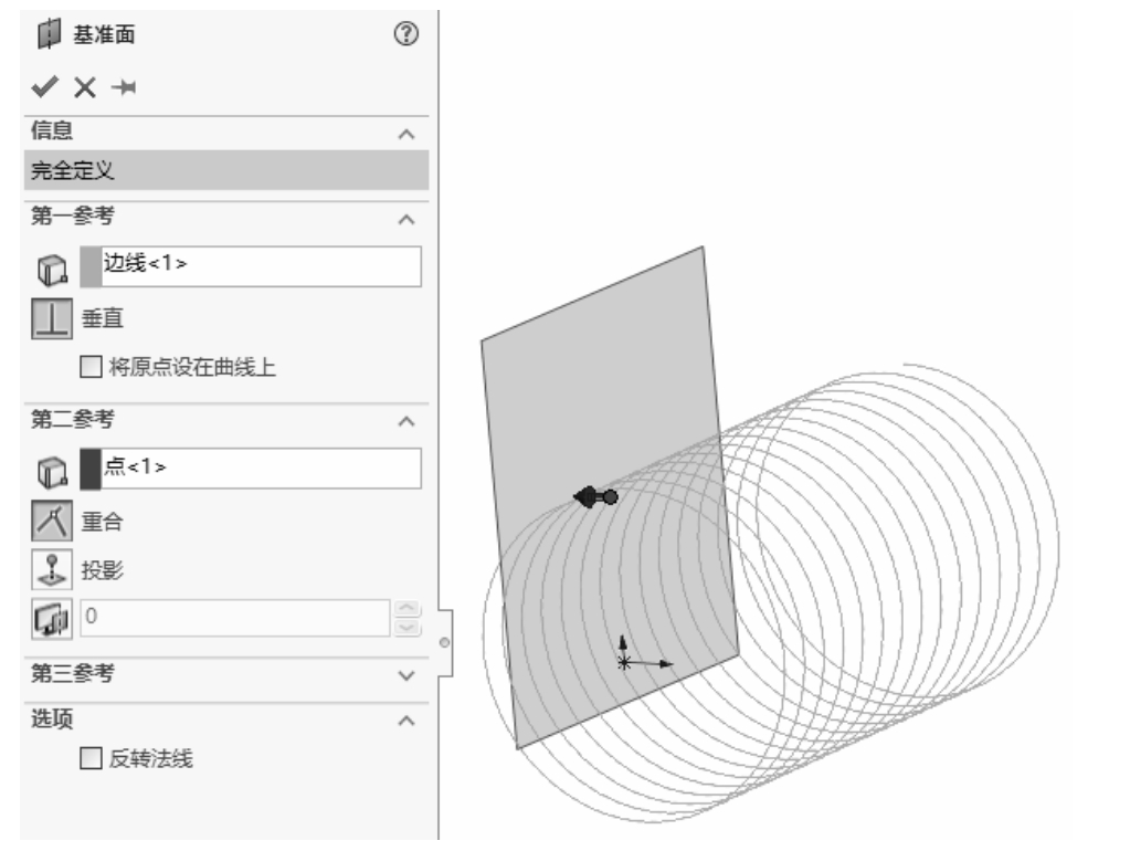 ,弹出“基准面”属性管理器;“第一参考”选择螺旋线本身,“第二参考”选择螺旋线起点,如图3-102所示,单击“确定”按钮