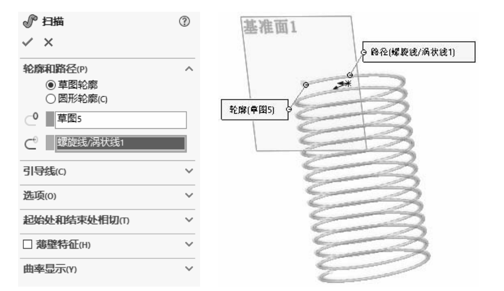 ,以步骤(7)中绘制的圆为扫描轮廓,以螺旋线为扫描路径进行扫描,如图3-104所示,单击“确定”按钮