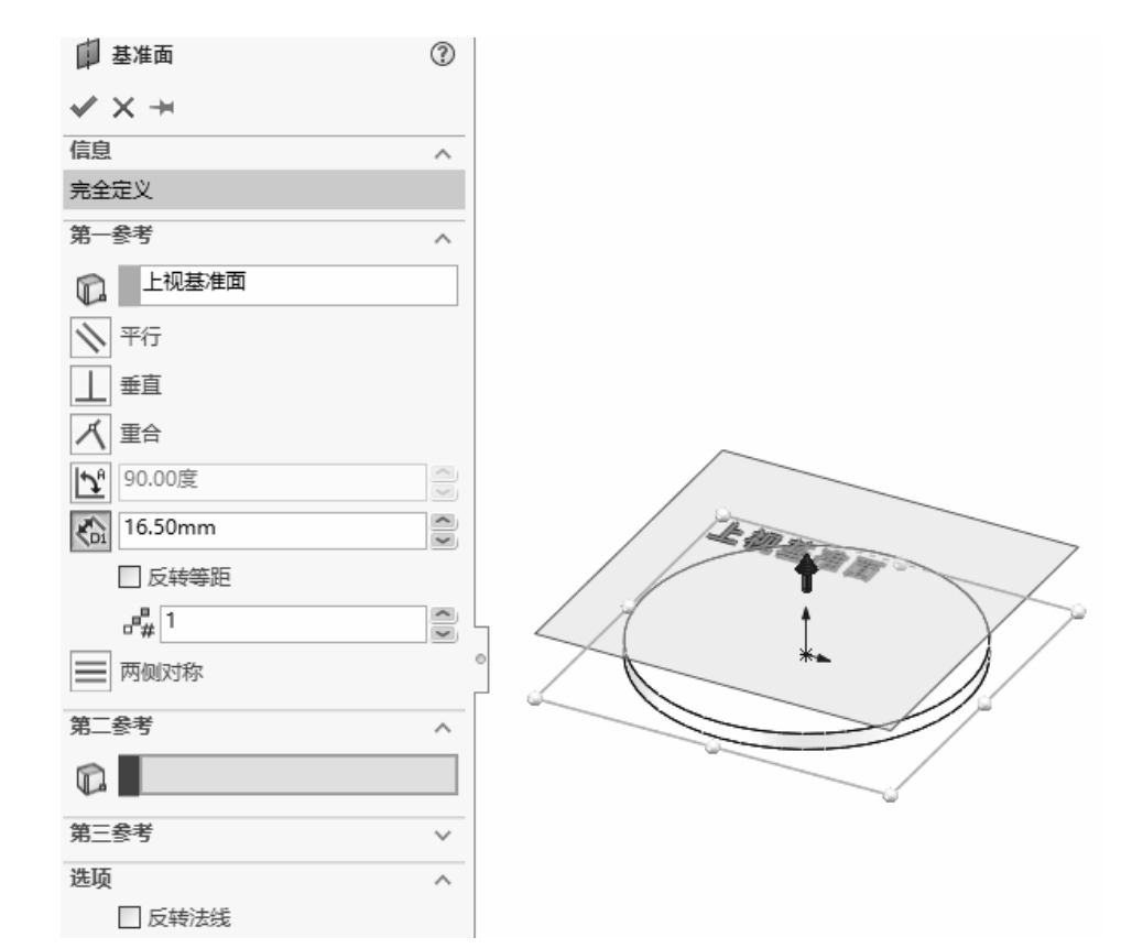 (34)创建基准面 5。选择FeatureManager设计树中的“上视基准面”,然后单击“参考几何体”