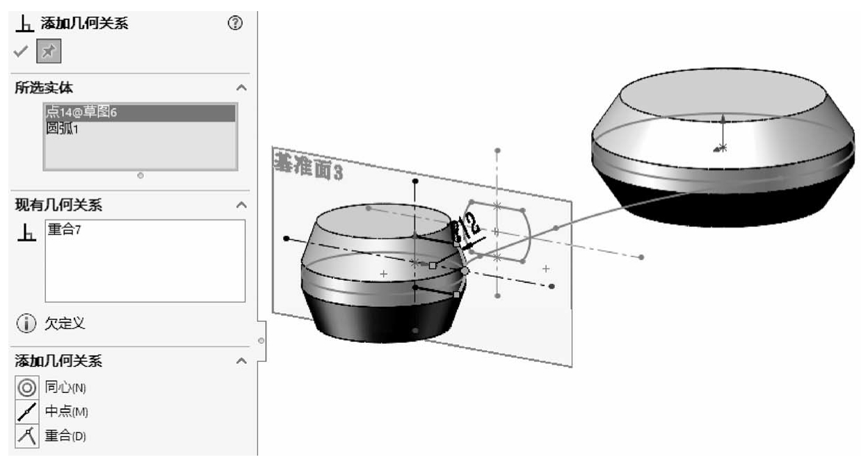 (21)添加重合几何关系。单击“尺寸/几何关系”选项卡上的“添加几何关系”按钮