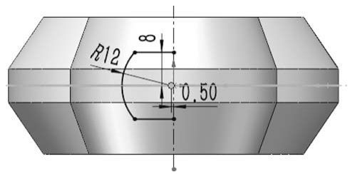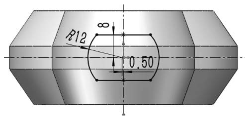 (17)镜向草图。按住<Ctrl>键,选取上步中绘制的直线和圆弧以及竖直中心线,单击“草图”选项卡上的“镜向实体”按钮