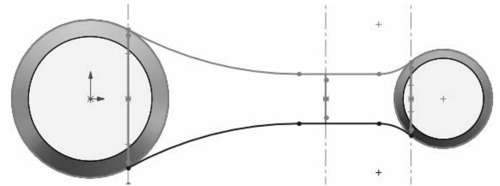 ,选择刚绘制的弧线和与之相交的两条直线为要镜向的实体,选择竖直中心线为镜向中心,生成第三个放样轮廓,如图3-136所示,退出草图绘制环境。