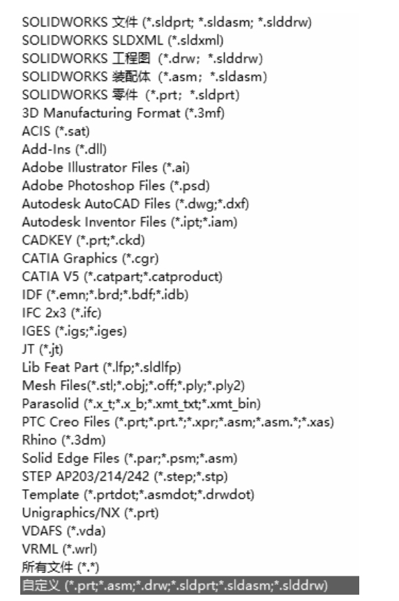 通过“文件类型”下拉列表框,还可以调用其他软件(如ProE、Catia、UG等)所形成的图形并对其进行编辑,如图1-31所示是“文件类型”下拉列表框。