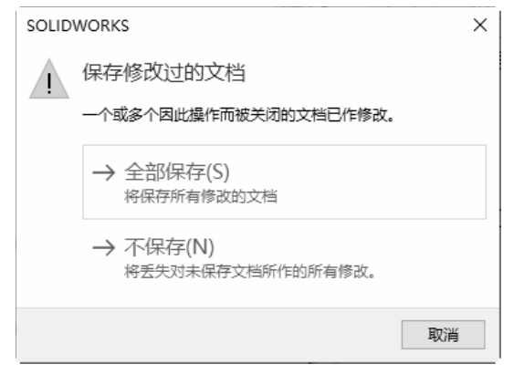 ,可直接关闭。如果对文件进行了编辑操作而没有保存,或者在操作过程中,不小心执行了关闭命令,会弹出系统提示框,如图 1-34所示。如果要保存对文件的修改,则选择“全部保存”选项,系统会保存修改后的文件,并退出SolidWorks系统;如果不保存对文件的修改,则选择“不保存”选项,系统不保存修改后的文件,并退出SolidWorks系统;单击“取消”按钮,则取消关闭操作,回到原来的操作界面。