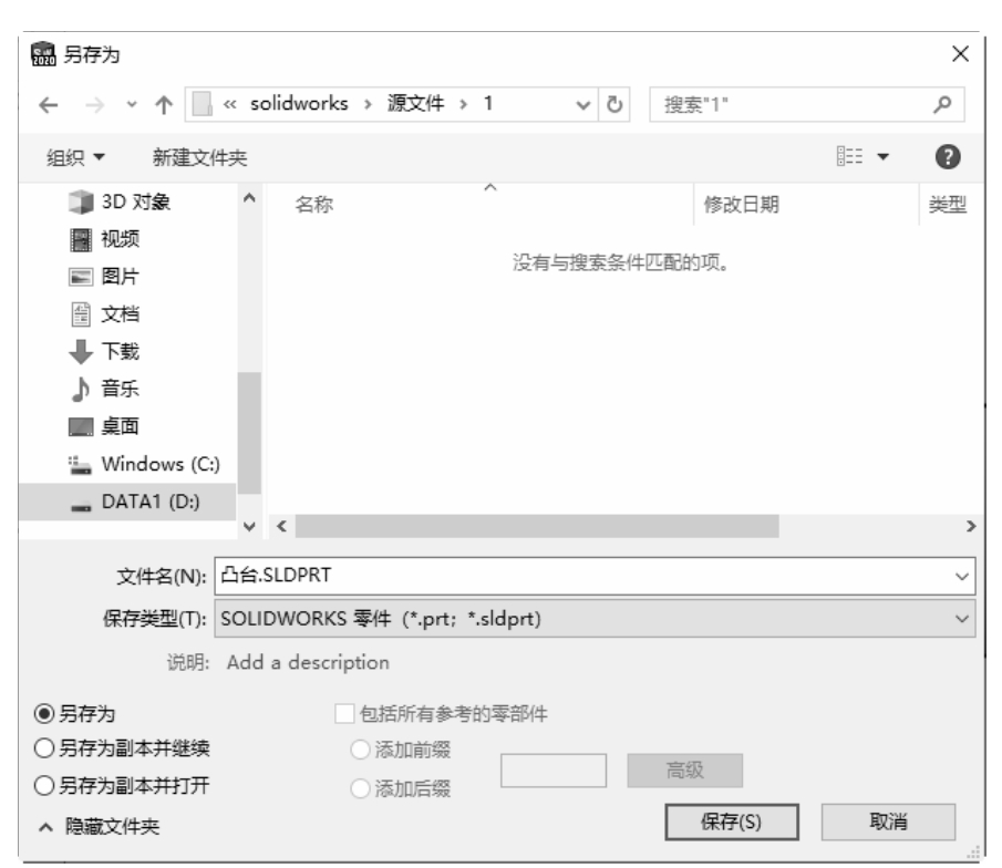 “保存类型”下拉列表框中,并不限于SolidWorks类型的文件,如“*.sldprt”“*.sldasm”“*.slddrw”等类型也存在。也就是说,SolidWorks 不但可以把文件保存为自身软件的类型,还可以保存为其他类型的文件,方便其他软件对其调用并进行编辑。