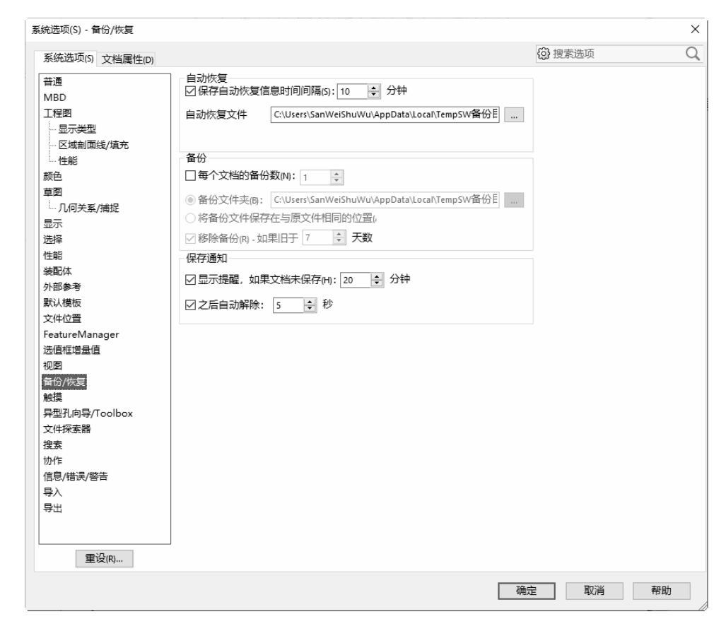 选择菜单栏中的“工具”→“选项”命令,系统弹出如图1-33所示的“系统选项-备份/恢复”对话框,单击“系统选项”选项卡中的“备份/恢复”选项,在“备份文件夹”文本框中可以修改保存备份文件的目录。