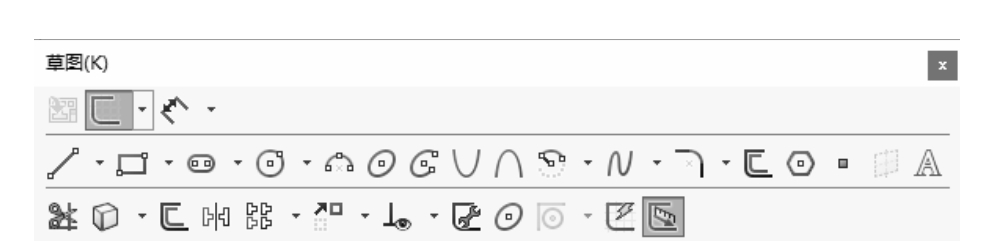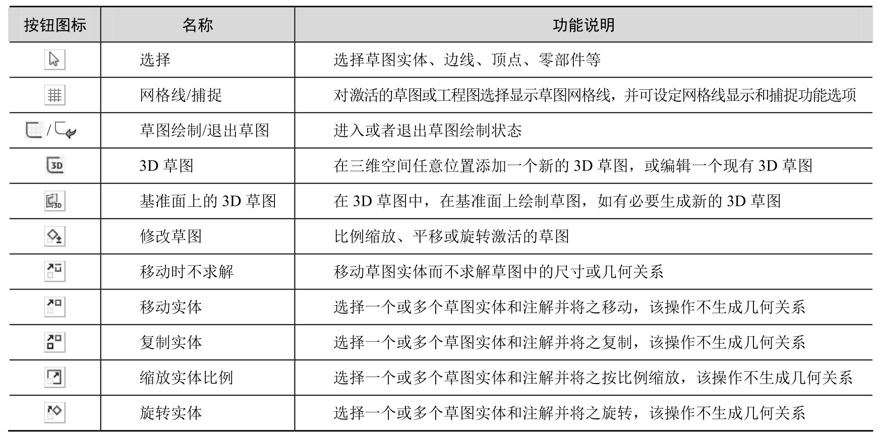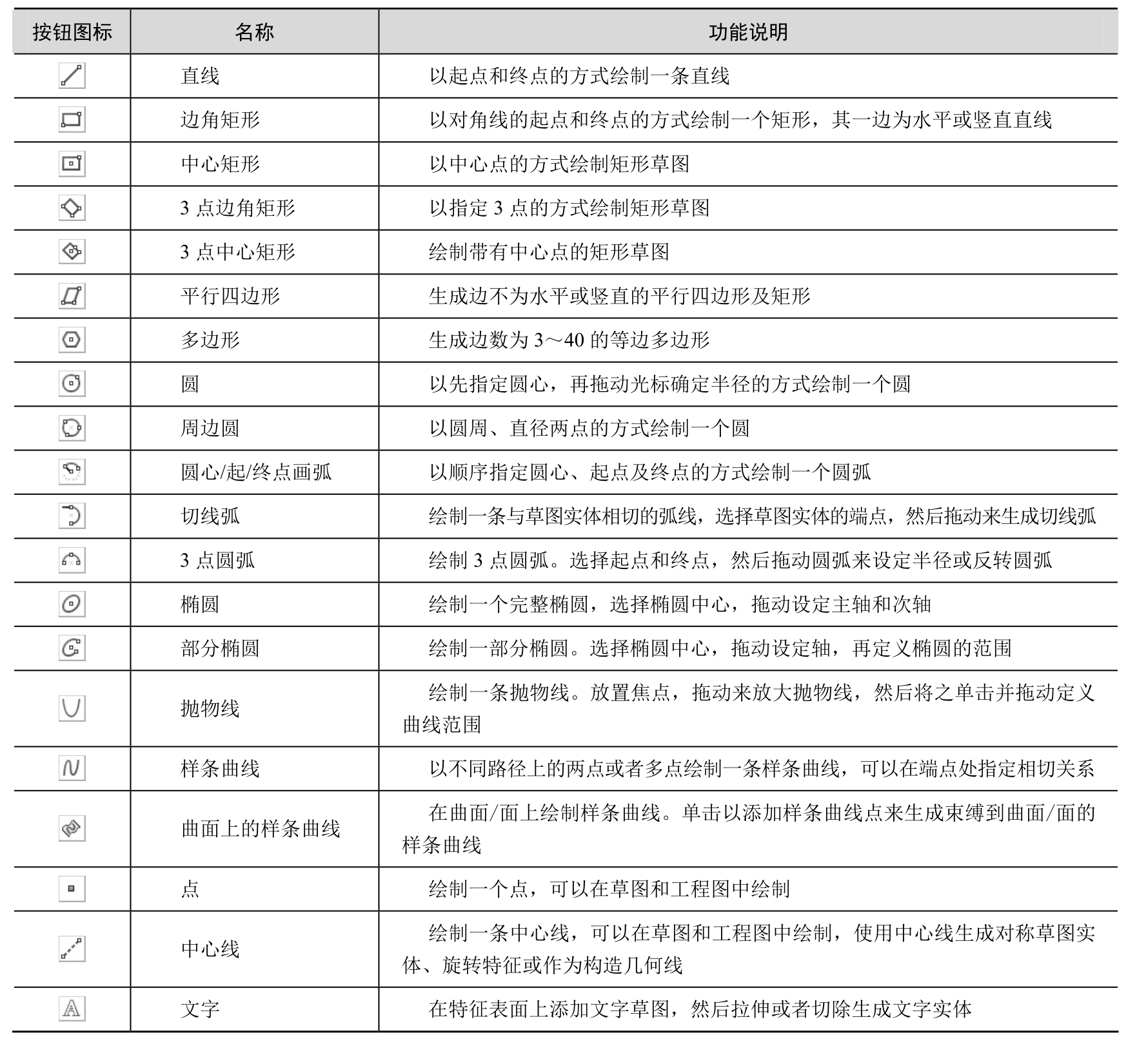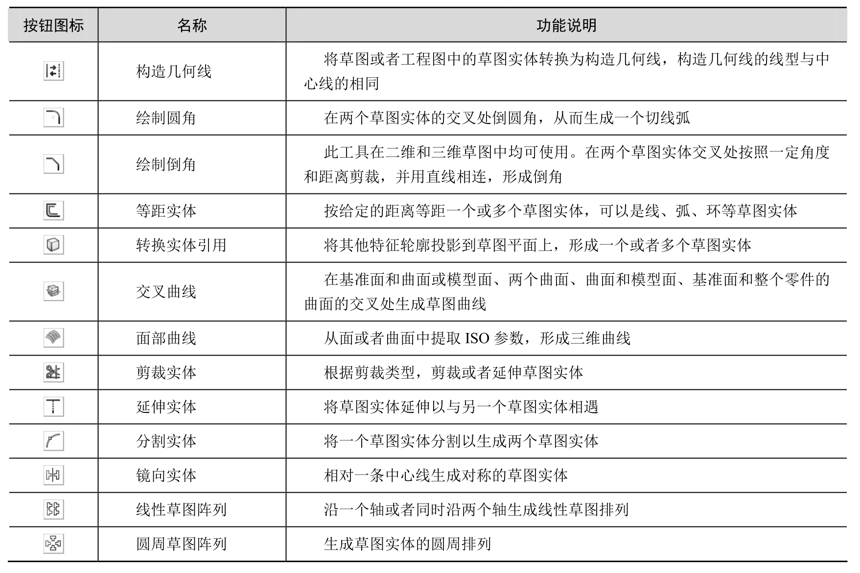 “草图”选项卡如图2-1所示,有些草图绘制按钮没有在该选项卡中显示,用户可以利用1.2.2小节中讲述的方法设置相应的命令按钮。“草图”选项卡中按钮功能主要包括 4 大类,分别是:草图绘制、实体绘制、标注几何关系和草图编辑工具。各命令按钮的名称与功能分别如表 2-1~表2-4所示。