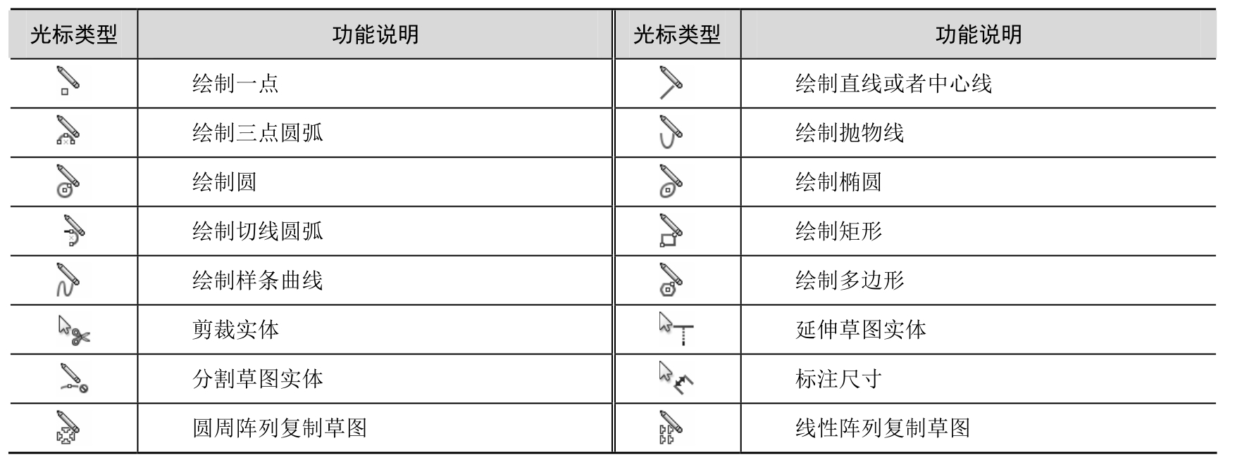 在绘制草图实体或者编辑草图实体时,光标会根据所选择的命令,在绘图时变为相应的图标,以方便用户了解其功能。
