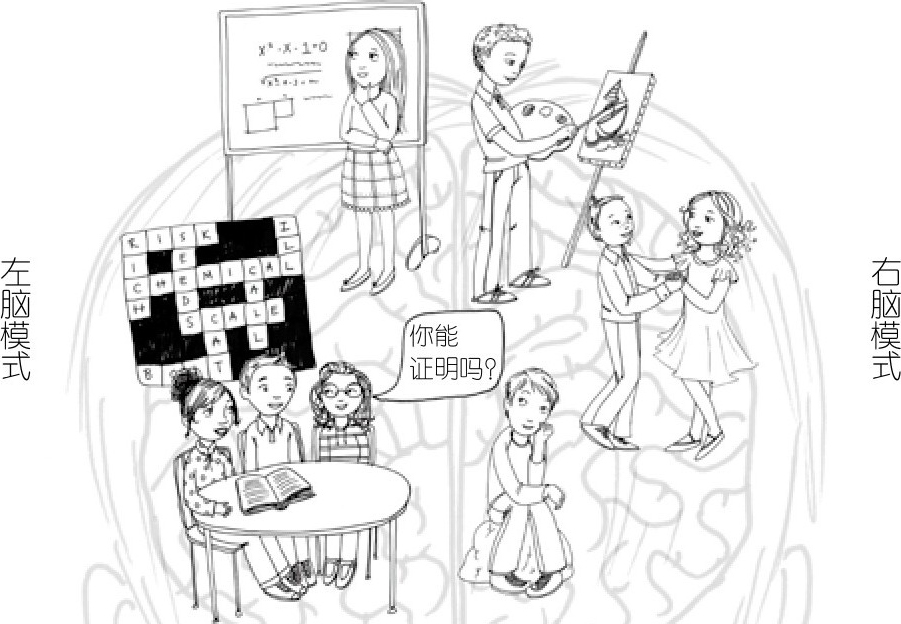 可能你已经知道大脑分成左右两个部分,这两个部分不仅在解剖学上是分离的,而且在功能上也非常不同。有人甚至认为,左右脑有各自独特的“个性”,它们都有“自己的想法”。科学界称,大脑影响我们的方式有“左脑模式”和“右脑模式”(见图2-1),但为了方便起见,我们将用通俗的说法讨论左脑和右脑。