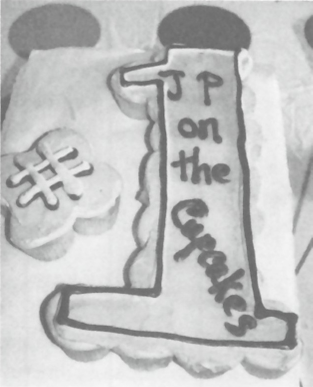 蒂娜从食品店为刚满一岁的儿子订购了一个蛋糕。她想要一个“纸杯蛋糕做成的蛋糕”,就是用糖霜把好多个纸杯蛋糕连在一起,这样看起来像一个很大的蛋糕。她下订单的时候告诉蛋糕师傅要把儿子的名字“JP”写在纸杯蛋糕上。结果,她在生日聚会开始前拿到了图2-2中的蛋糕,上面写着:JP在纸杯蛋糕上。