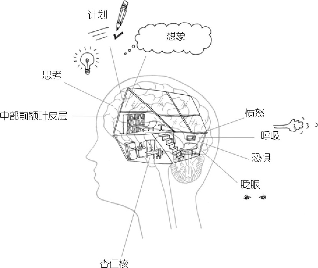 上层大脑则完全不同。它由大脑皮层及其各个部分构成,尤其是额头后面那部分,包括所谓的中部前额叶皮层。与本能的下层大脑不同的是,上层大脑进化程度更高,可以给你一个更加全面的视角看待世界。你可以把它想象成一个明亮的位于二楼的书房或图书室,四面和天花板装满了窗户和天窗,视野更加清晰。在此发生的是更加复杂的心理过程,比如思考、想象和规划。