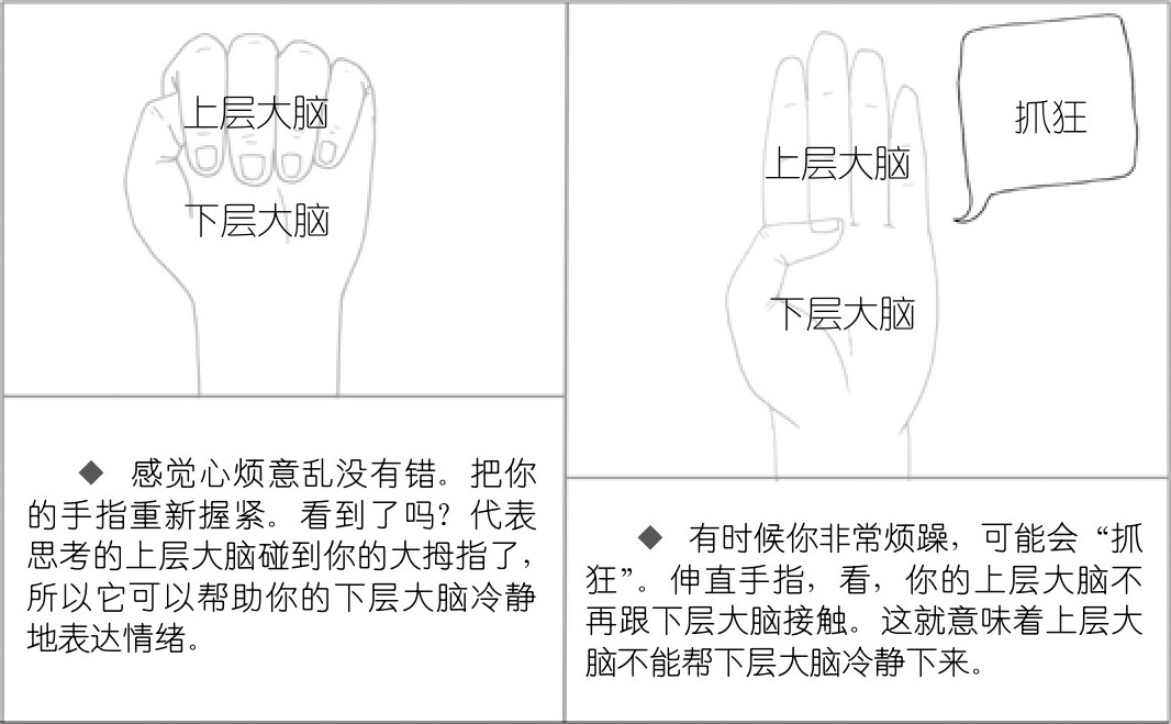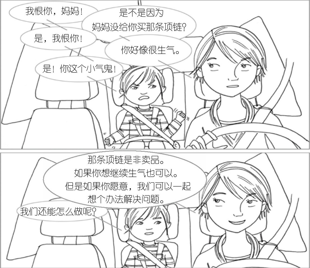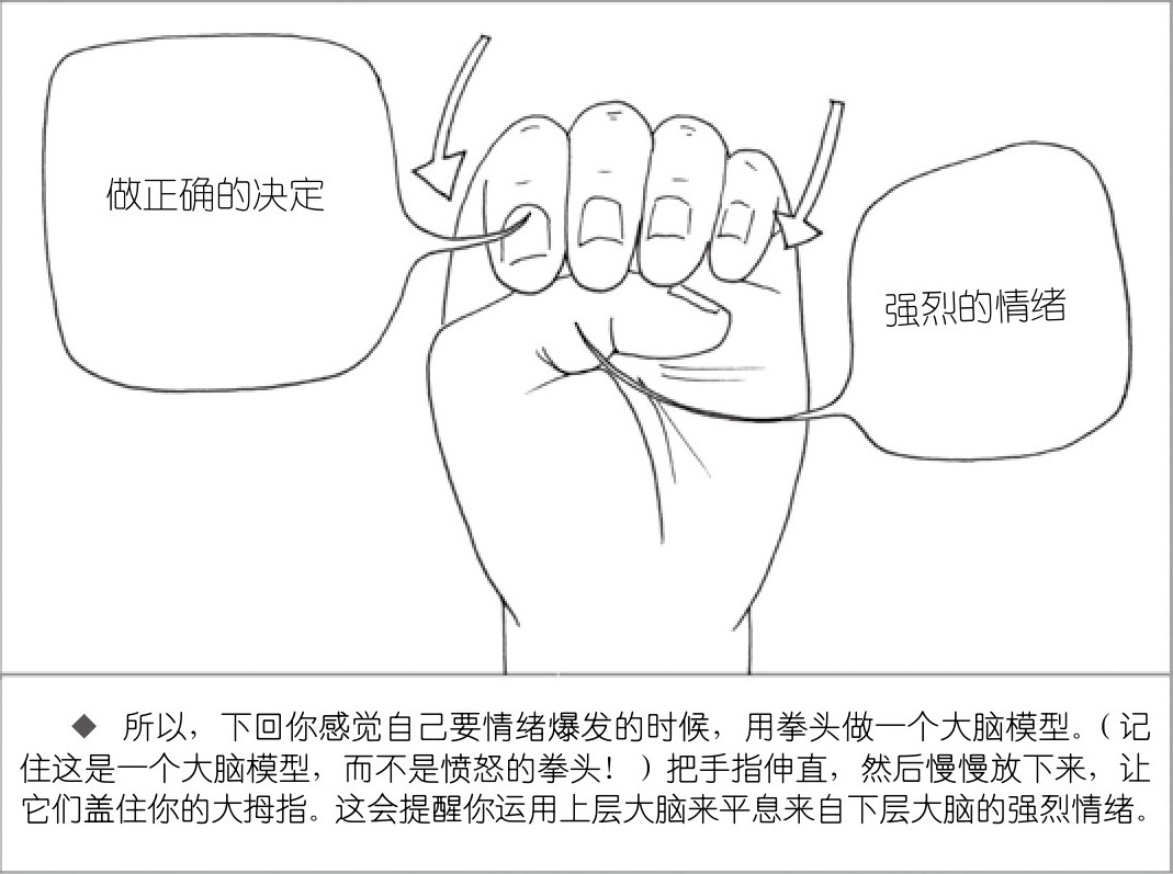 请看图解中的案例。母亲在女儿发脾气时,并没有下最后通牒,触发女儿的下层大脑。相反,她引导女儿使用精确而具体的词汇描述自己的感觉(“你是不是因为我没给你买那条项链而生气”),以此调动女儿的上层大脑。接下来她邀请女儿和她一起想办法解决问题。一旦小姑娘问“我们还能怎么做呢”,妈妈就知道上层大脑开始起作用了,女儿可以和妈妈一起商讨问题了,而几秒钟之前她还做不到。