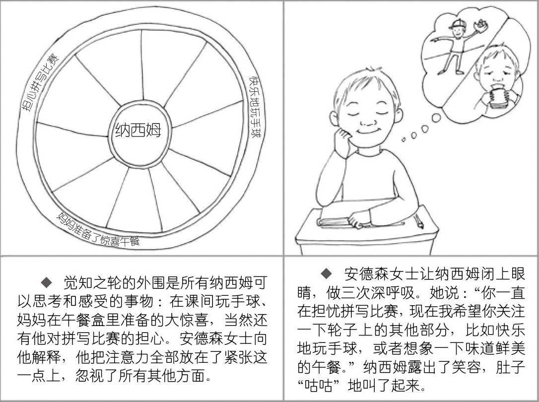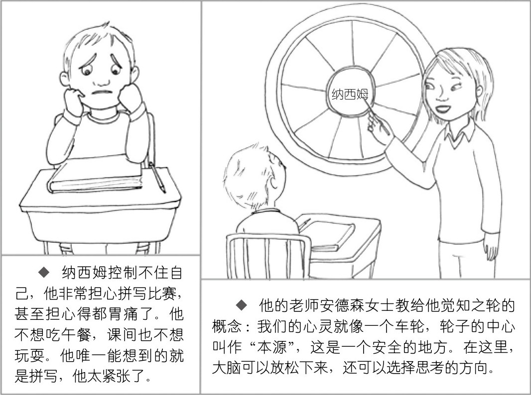 我们已经讨论了第七感和专注的力量。当孩子执着于其觉知之轮的某一组面向时,我们需要帮助他们转移注意力,促进他们的自我整合。他们将发现自己不必成为感觉、意象、感受和念头的受害者,从而决定如何思考和感受他们经历的一切。