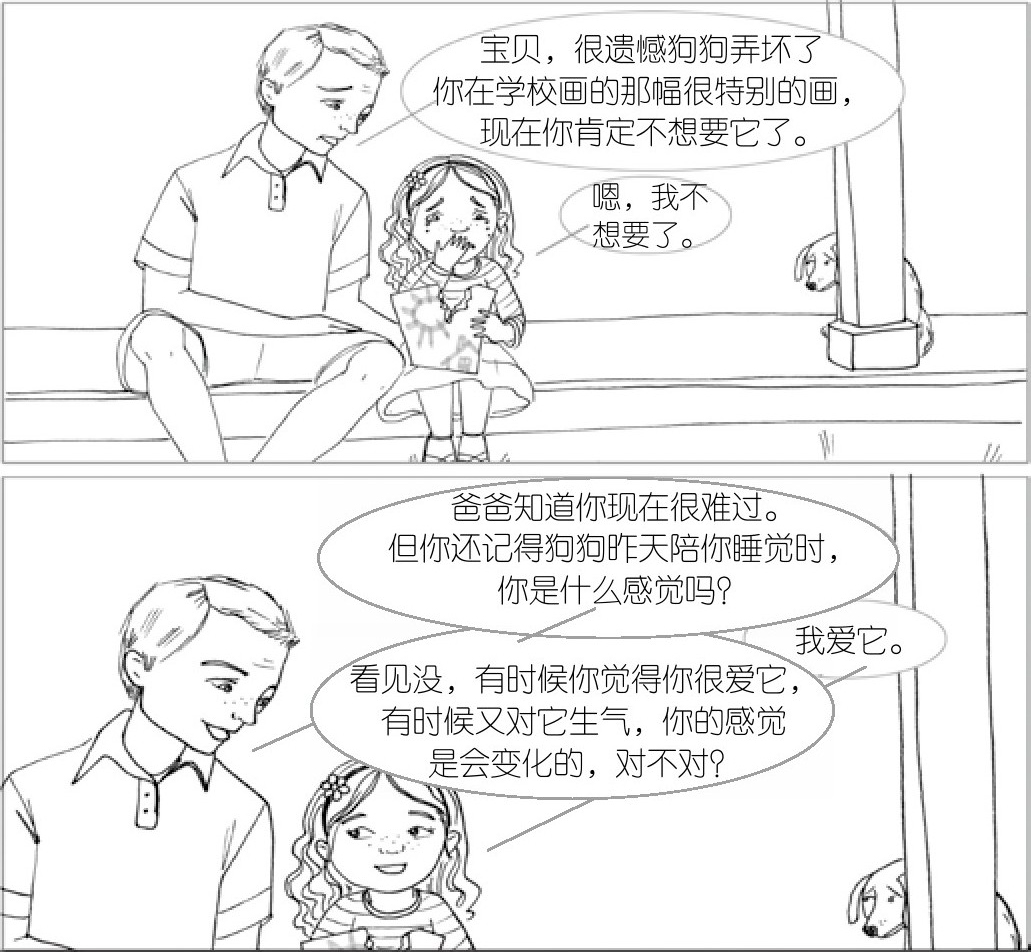 因此我们必须帮助他们了解,感受是暂时的,平均来说,一种情绪从产生到消逝的时间不会超过90秒。如果我们能让孩子了解,感受是转瞬即逝的,我们就能帮助他们发展第七感,就像我们之前提到的男孩,他能纠正自己:“我不愚蠢,我只是现在觉得自己很愚蠢。”