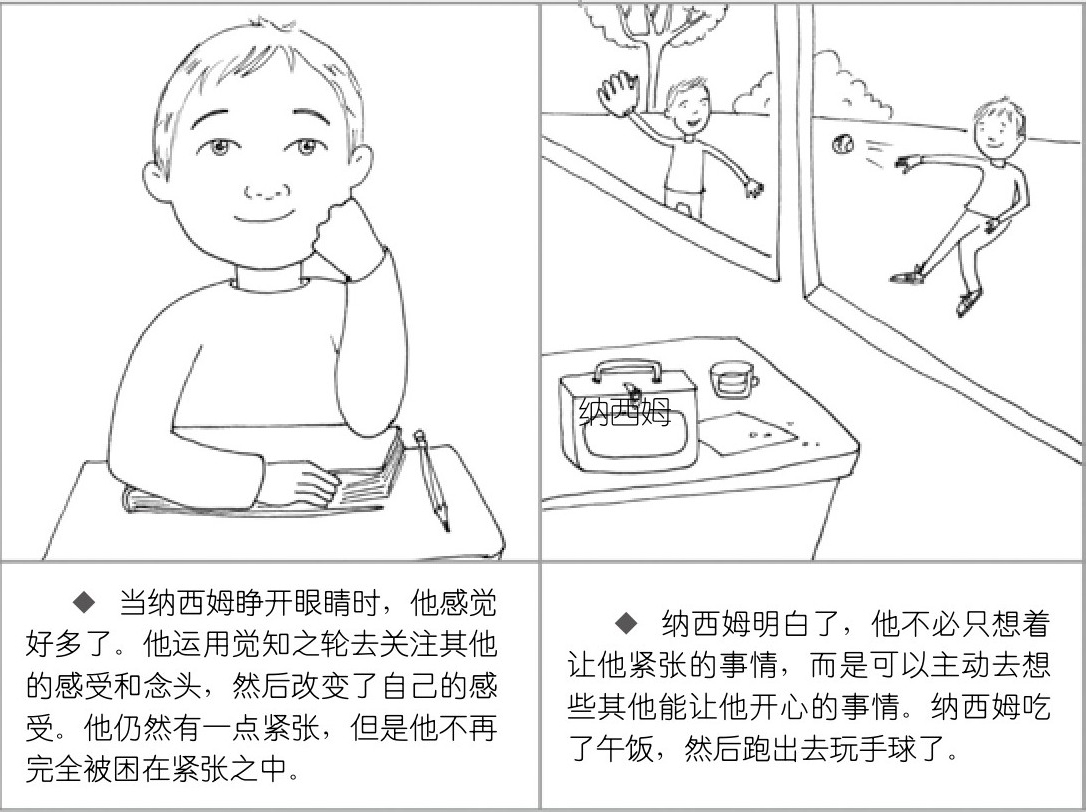 念头不同于感觉和意象,念头在“审查”过程中更多地代表左脑的功能。它们是我们的所思所想,是我们对自己说的话,是我们用语言讲述自己的生活故事的方式。同审查感觉和意象一样,孩子也能学会留意他们头脑中闪过的念头,并且明白不是每个念头都必须相信。他们还可以与那些没用的、不健康的甚至不真实的念头争辩。