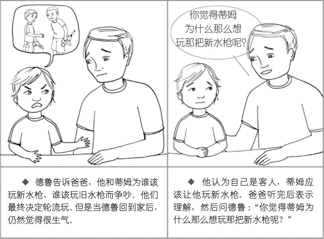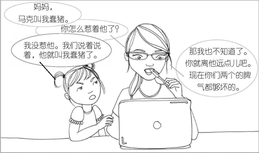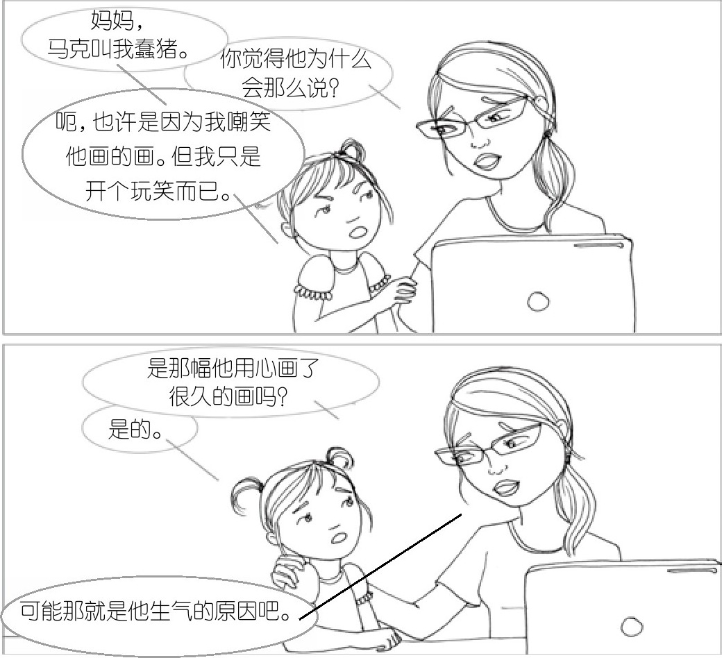 要教给孩子这个技巧是很难的事情,尤其是在处于激烈的争吵中时。但是如果我们对自己的言行保持警觉,就更可能取得理想的教育效果。比如,你可能想说:“呃,你怎么惹着马克了?我敢肯定他不会无缘无故就叫你蠢猪。”