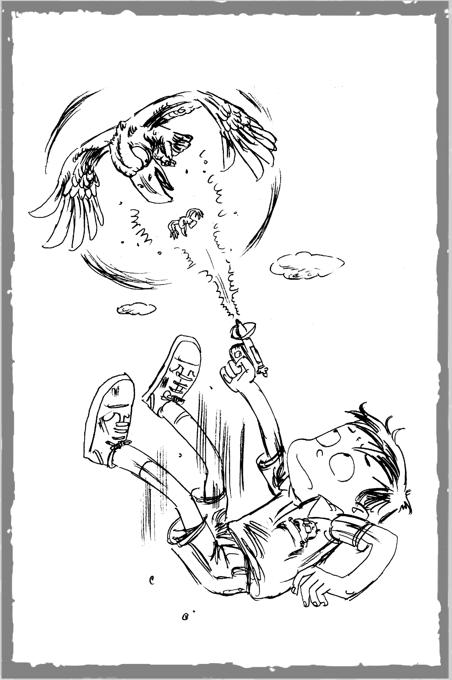 但已经来不及了,缩小枪射出的光束击中老鹰,老鹰瞬间变小了,变得比我还小。它不仅抓不住我,还被我拖着一直往下坠。后来,它反应过来,松开了爪子。我下落的速度越来越快……这时,我悔得肠子都要青了。唉,要是时光可以倒流,我绝不会在空中对老鹰开枪。从这么高的地方掉下去,我会被摔得粉身碎骨的。