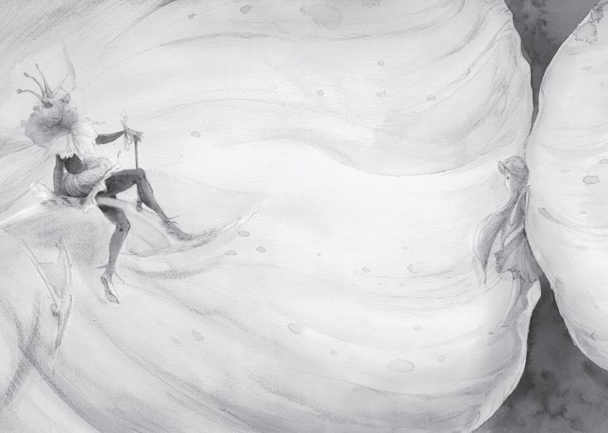 一根大理石大圆柱倒在地上,倒下时它断成了三段。在这三段圆柱之间长着最美丽的大白花,燕子于是背着拇指姑娘飞下来,把她放在其中一片宽大的花瓣上。但是她多么吃惊啊,因为她看到花当中有一个一丁点儿大的人,又白又透明,像是水晶做的。这小人头戴金冠,肩上长着好看的双翅,个子比拇指姑娘大不了多少——他是花的天使。每朵花里都住着一个天使,男的或者女的,这一个是他们大家的国王。