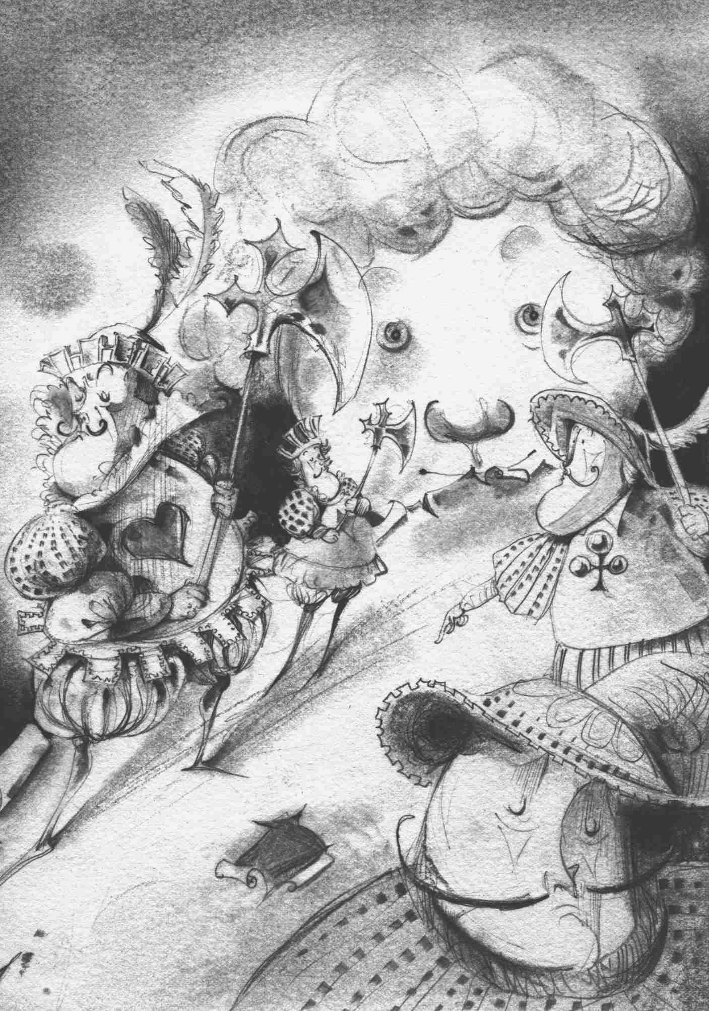 “我是我国王和王后的杰克,不是你的,”红心杰克说,“我能从纸牌和镜框上下来。我仁慈的国王和王后也能够,甚至比我更利索。我们可以走出去,到大千世界里去,只是旅途太累人,我们去厌了。还是坐在纸牌里更舒服、更开心,可以自得其乐。”