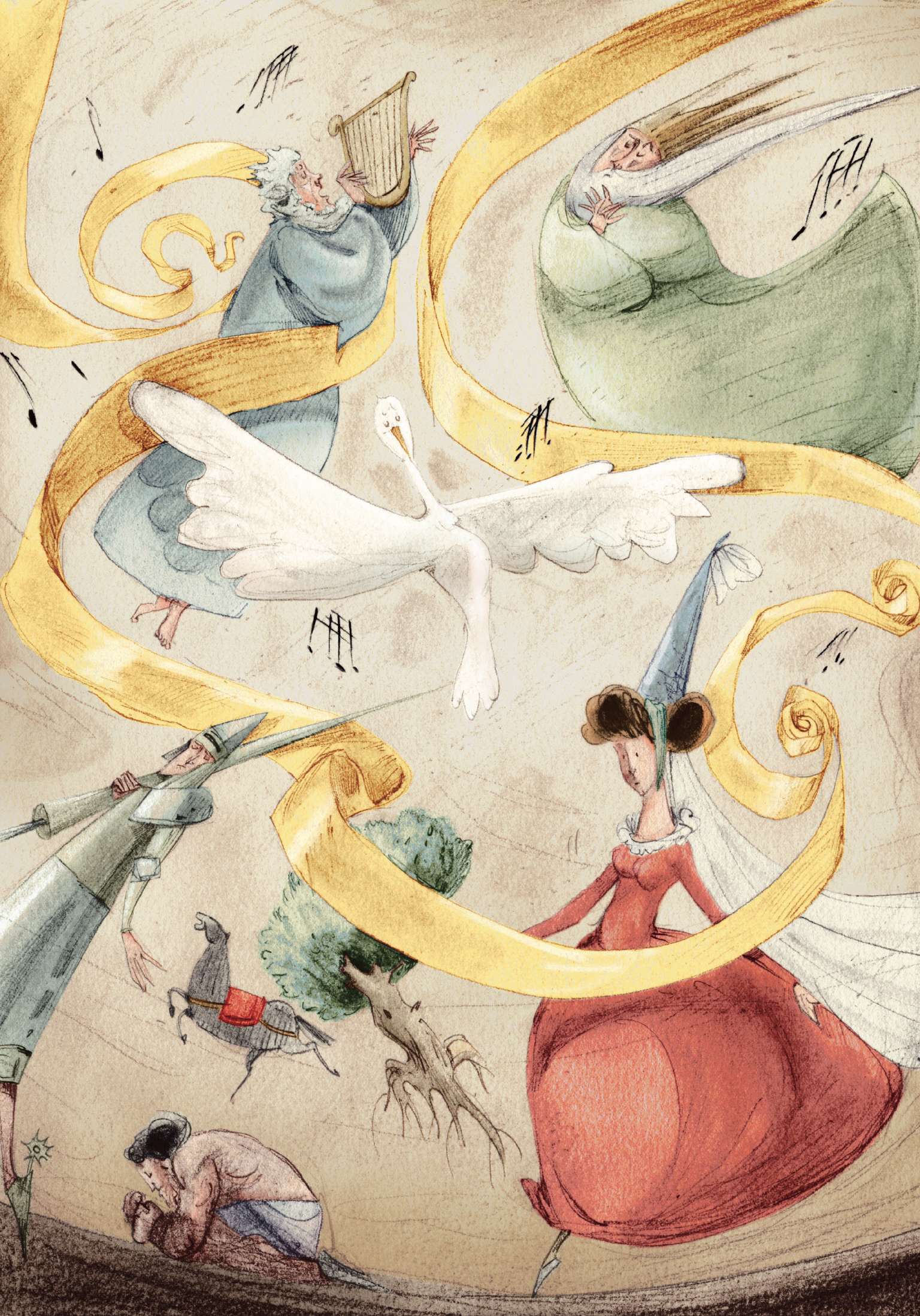 当太阳要下去时,爱莉莎看到十一只头戴金冠的白天鹅,一只接着一只,像根白飘带似的向着陆地飞来。这时候爱莉莎从海岸走下斜坡,白天鹅扑动他们雪白的大翅膀。
