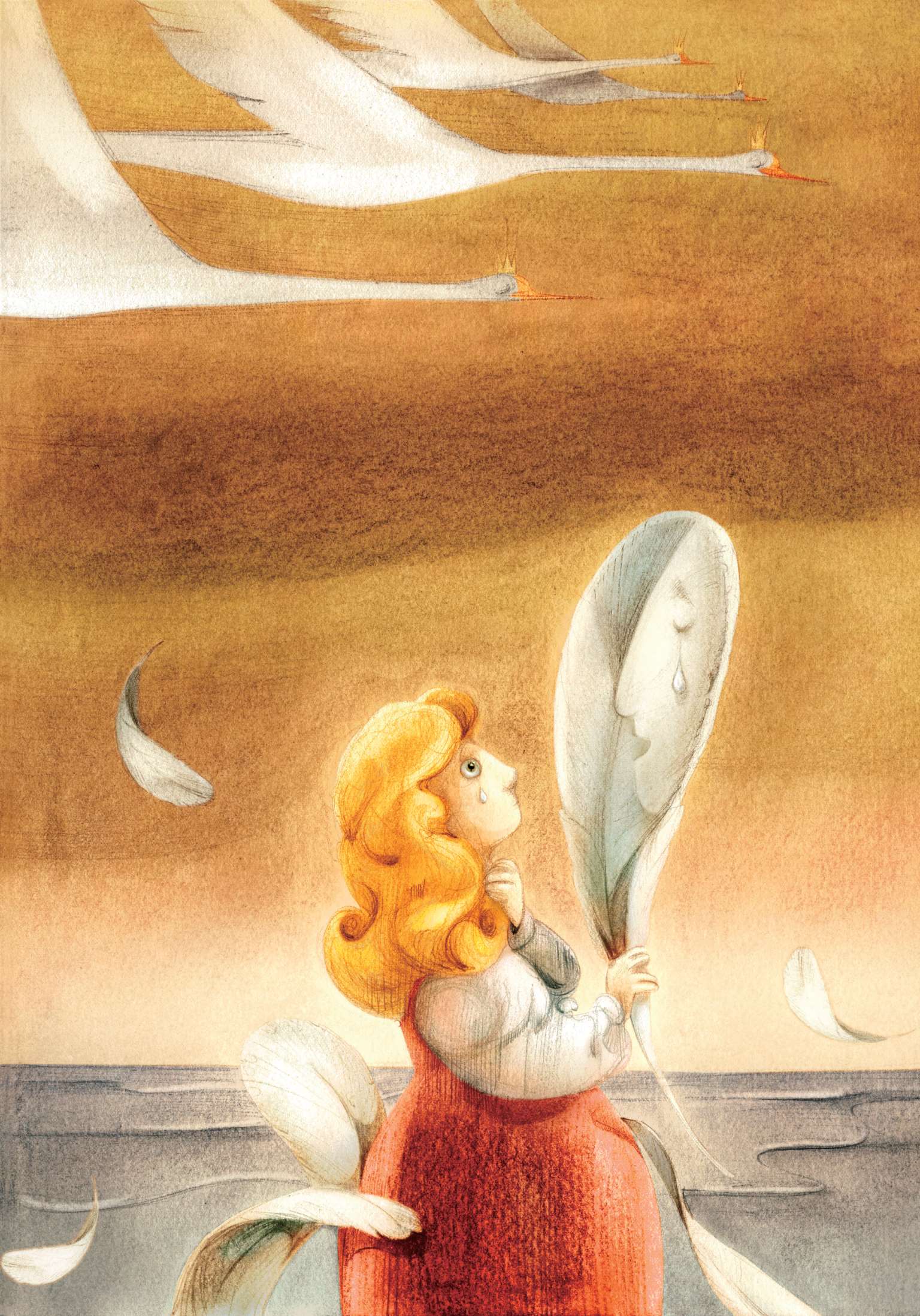 当太阳要下去时,爱莉莎看到十一只头戴金冠的白天鹅,一只接着一只,像根白飘带似的向着陆地飞来。这时候爱莉莎从海岸走下斜坡,白天鹅扑动他们雪白的大翅膀。