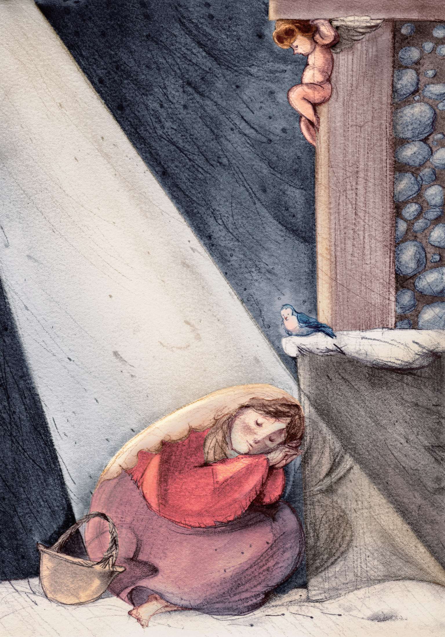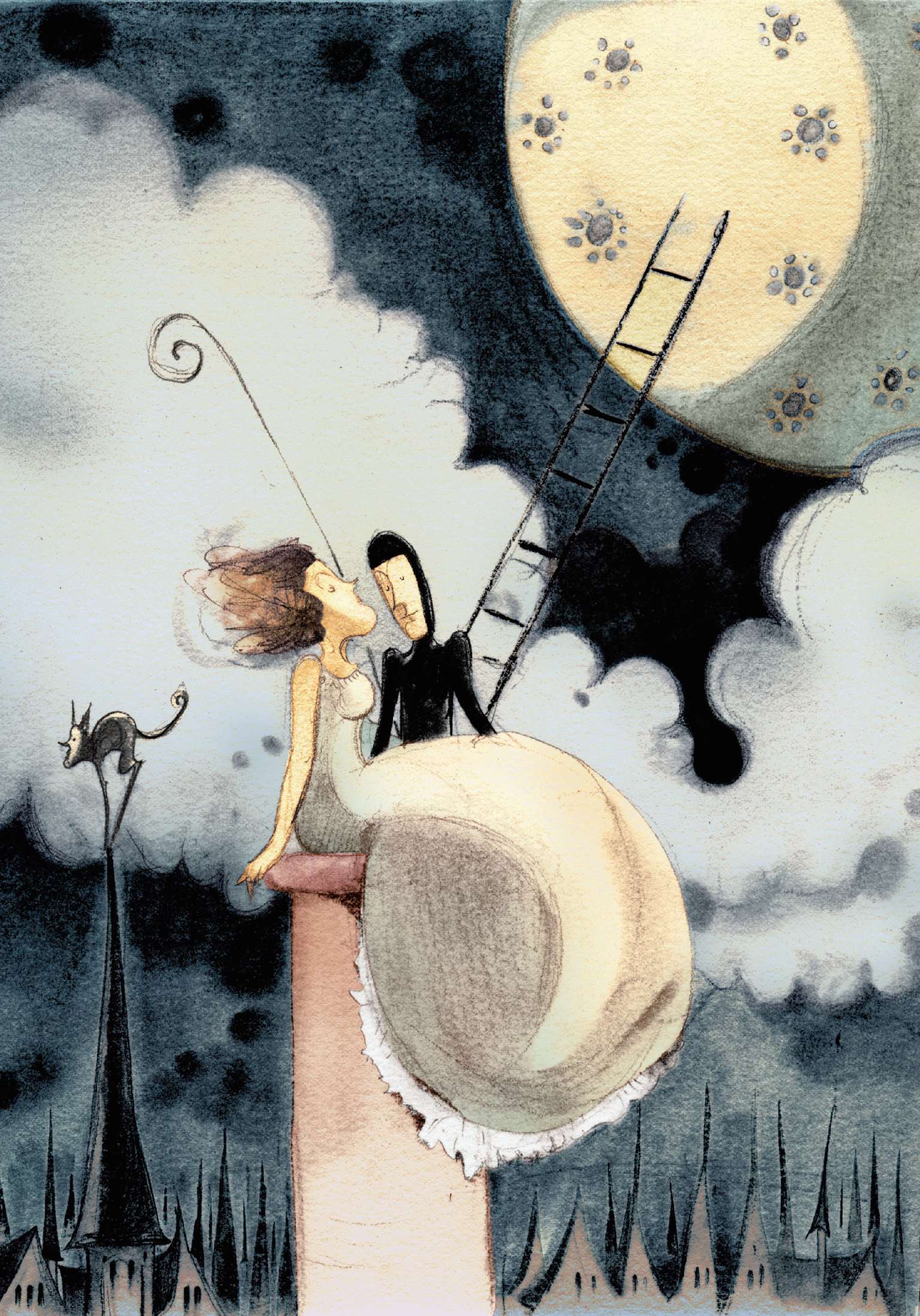他们头顶上是星空,他们下面是满城的屋顶,他们可以看得很远,看到广阔的世界。可怜的小牧羊女把头靠在她的扫烟囱人的肩上,直哭到她彩带上的金色都被泪水洗掉了。世界和她原先想的是那么大不相同。