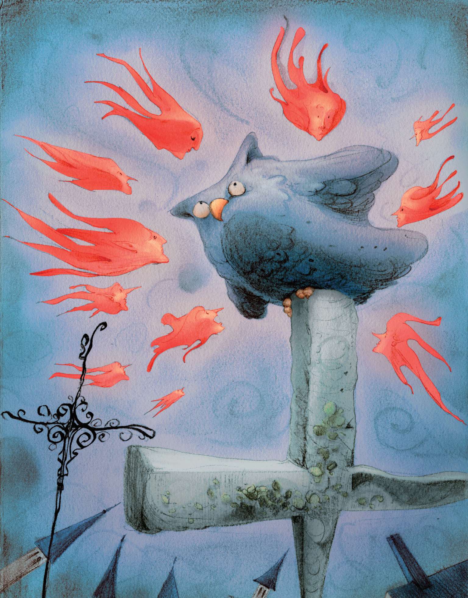 我坐在你这会儿正坐着的箱子上,所有十二个新生小鬼火在我的膝盖上。它们像萤火虫般发光,已经开始跳,时刻在长大,因此一刻钟不到,它们一个个看上去已经像它们的爸爸或者叔叔伯伯那么大。