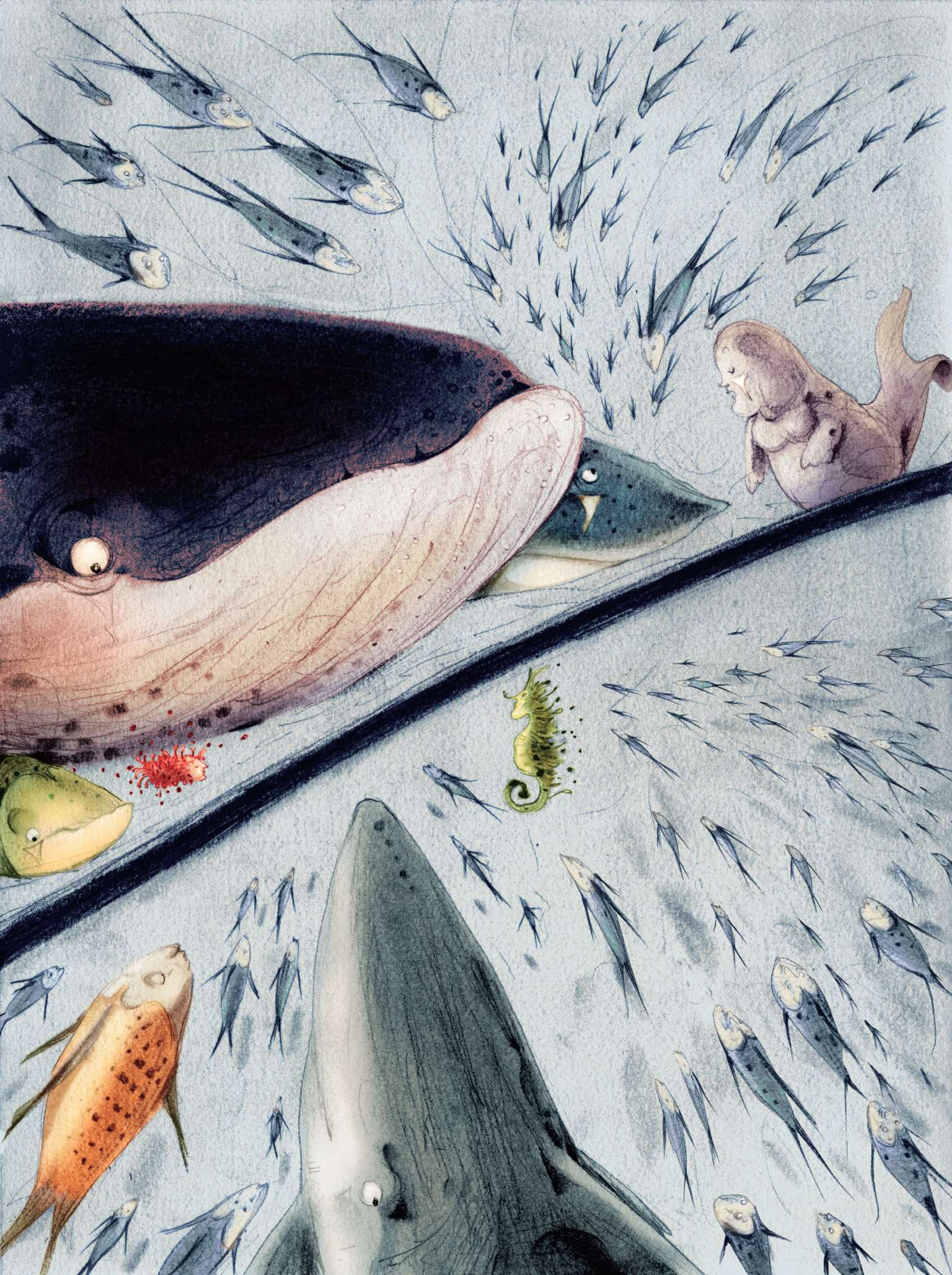 所有的鱼——对了,甚至蜗牛和海里一切游的东西,一切爬的或随波逐流的东西,全都看到了这忽然从上而降的可怕怪物,这大家没见过的大海鳗。