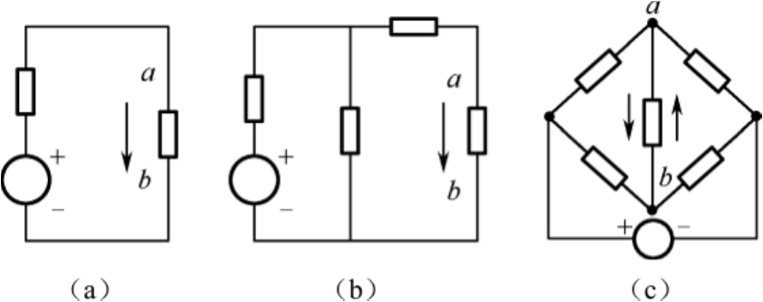 在电路中,电流是由电源正极流向电源的负极的。从图1-3(a)中可知,电流是从 a 点流向 b 点的。同样在图1-3(b)中,电流也是从 a 点流向 b 点的。但是在图1-3(c)中,不能判断电流是从 a 点流向 b 点还是从 b 点流向 a 点,这就给电路分析造成了困难。如果再进一步具体分析一下,从 a 到 b 的中间这段支路中,它只能有一个电流,其大小是确定的。其方向不是由 a 流向 b ,就是由 b 流向 a 。根据数学的正、负数和相反数的知识,我们可以先假设某一个方向为正方向,然后在这个假设的前提下,利用电路基本定律来求解电路。如果求出电流是负值的话,这个负值不可能表示欠电路电流,它只能表示电流的方向与假设相反,是从 b 流向 a 。反之,求出的电流是正值,则表示电流的方向与假设是一样的,从 a 流向 b 。