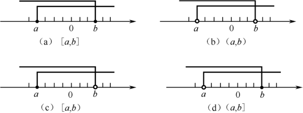 (4)区间:在数轴上,空心圆点表示开区间,实心圆点表示闭区间,如图1-2所示。