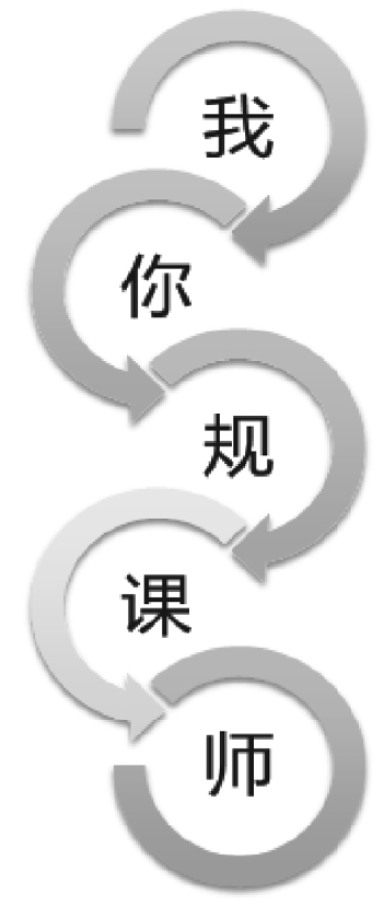 主持人的作用是什么呢?任何场合的主持人,其作用基本相同,其核心作用就是串场,培训主持也不例外。培训主持的串场,从开场开始。那么,要做好培训开场,需要我们在开场主持中做好哪几件事呢?根据事情针对的对象不同,我们可以将其归纳为“我你规课师”五件事,如图1-21所示。