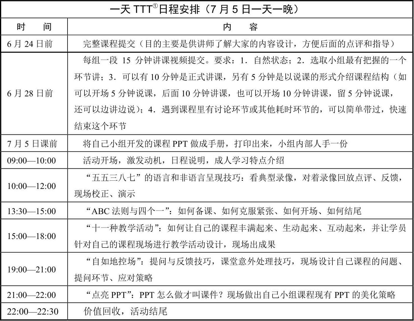 课程信息要简明扼要地说明课程的亮点内容,明确课程内容的边界。如果这次培训包括多门课程,那么首先要确认的是各门课程的先后顺序、各自需要多长时间,以及培训从开始到结束具体的日程安排。课程信息样表如表1-2所示。