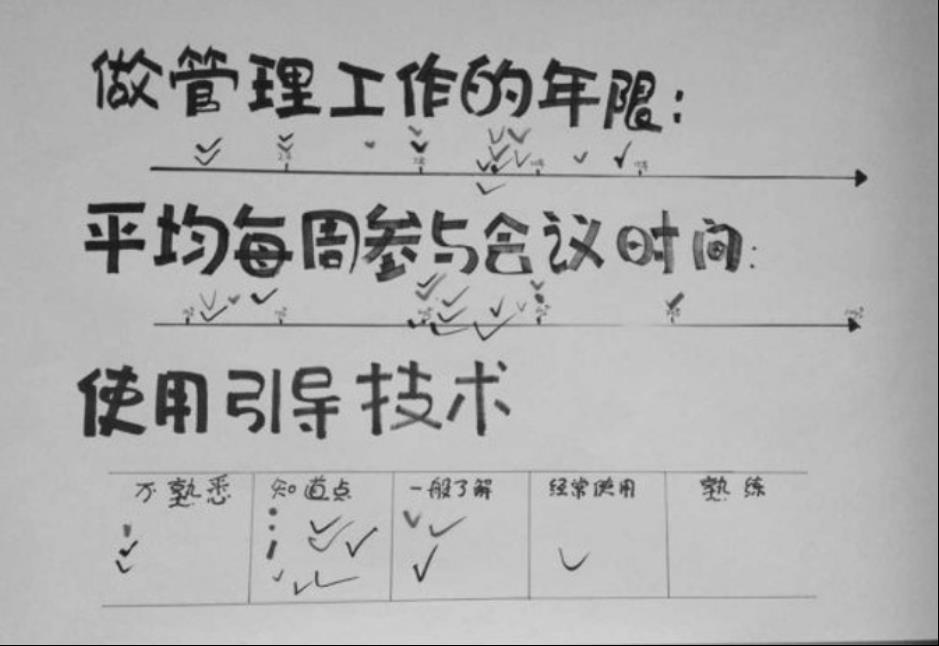 方式二:在培训教室门口处张贴提前设计好的大白纸,可以请学员用记号笔在每个调查项目的对应位置做标记,也可以提供小贴纸(不限形状),请学员根据自己的实际情况,贴在相应位置,如图1-6所示。
