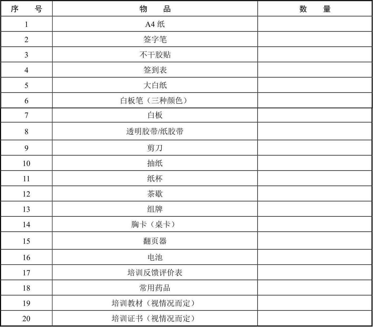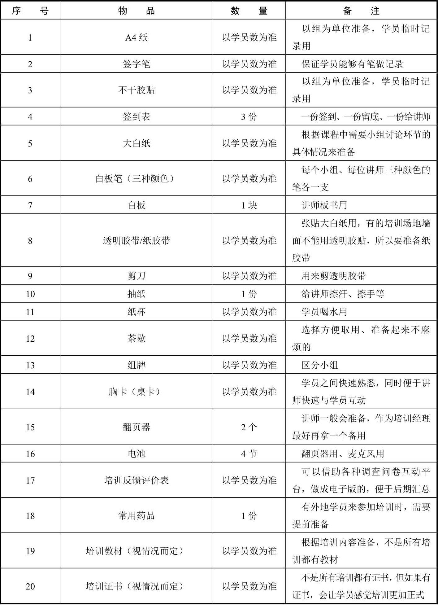 第一个要清楚的便是需要准备什么。一场培训要顺利开展,所需要的物料可以分为基本物料、特殊物料、锦上添花型物料三种。基本物料是指无论是什么主题的培训都需要准备的物料;特殊物料与培训主题密切相关,不是每场培训都需要准备,只在相关主题的培训中才需要用到;锦上添花型物料,不是培训必须准备的,但如果有条件准备,会给学员及整个培训过程带来意想不到的促进效果和附加价值,对于准备物料的人来说,这也是一种挑战。