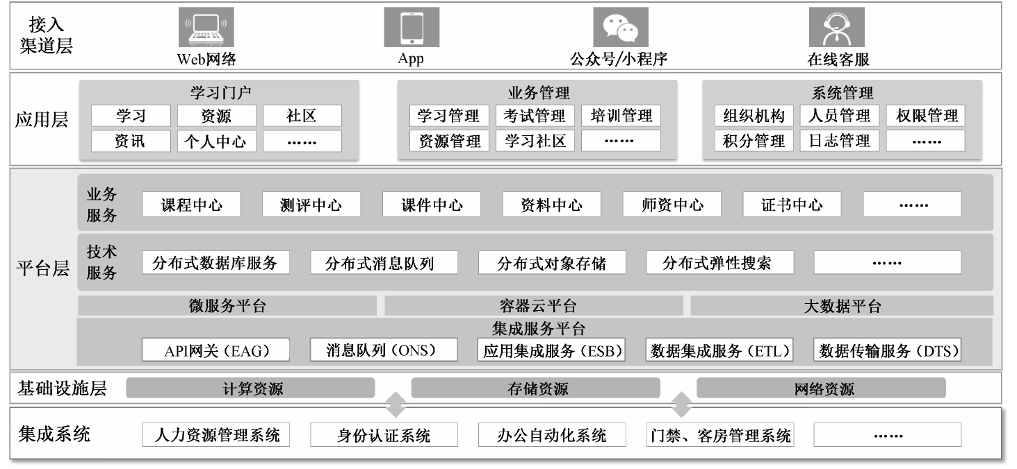 (2)应用层:包括学习门户、业务管理、系统管理等应用。其中,学习门户的面向对象是学员,其功能主要包括学习任务、学习资源、学习社区、综合资讯及个人中心;业务管理的面向对象是应用管理员,其功能主要包括学习管理、考试管理、培训管理、资源管理、社区管理及各类分析报表;系统管理的面向对象是系统管理员,其功能主要包括组织机构、人员管理、权限管理等。