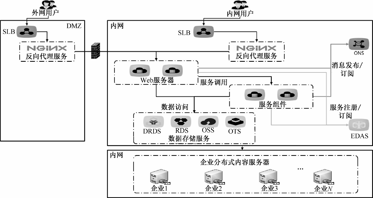 (5)存储层采用多种主流的数据存储技术,基于DRDS、RDS实现结构化数据的存储,通过分库、分表以提高系统并发能力;基于OSS技术以实现文档、图片等非结构化数据的存储;基于Redis技术实现缓存数据的存储,以降低数据库的访问压力。