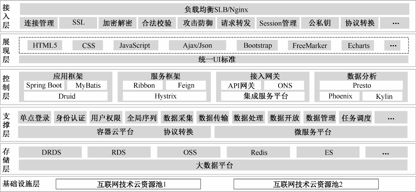 (3)控制层采用目前主流的应用框架、服务框架进行应用和服务的开发,通过建设业务组件形成共享服务层,并通过接入网关对外开放服务能力,同时实现服务和数据的集中共享。