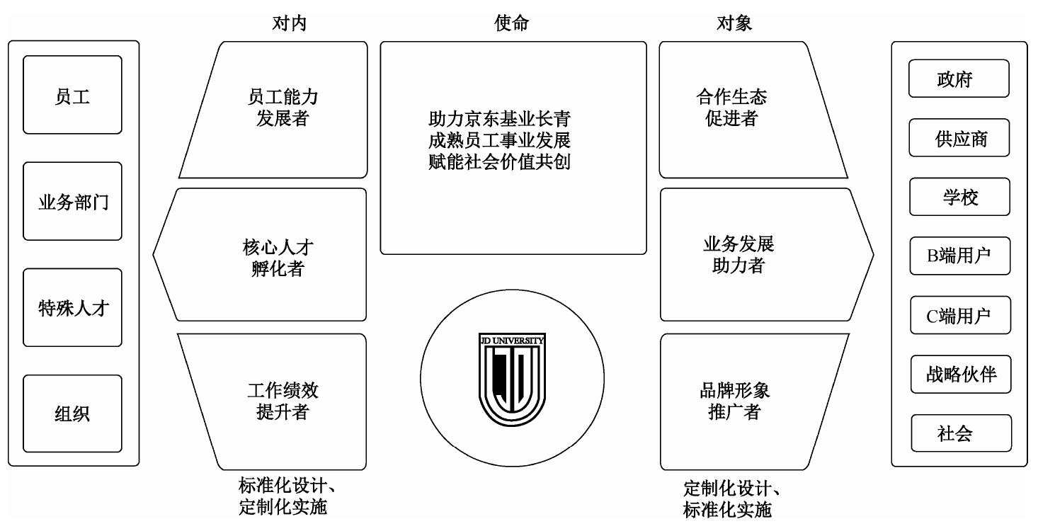 (1)明确数字化学习平台在企业中的定位与目标。清晰的定位与目标及上层领导的支持决定着数字化学习平台未来的发展。京东大学在线学习平台定位如图2所示。