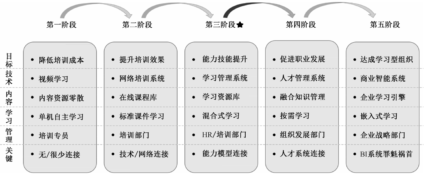 数字化学习平台的建设是一项系统工程,企业应从数字化学习平台的内容及运营等方面,根据需要进行系统的规划和建设。不同的数字化学习平台其功能的侧重点往往不同。企业选择数字化学习平台时,需要首先明确自身需求,评估企业应用规模、IT基础设施、短期需求、未来核心需求等多个综合因素。企业可以参考Bersin的E-Learning成熟度模型来进行系统的规划。E-Learning成熟度模型如图1所示。