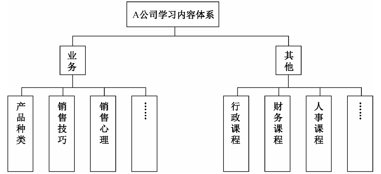 A公司是一家销售型公司,在经过前期市场调研和内部调研后,A公司决定将学习体系划分为两个板块,业务板块以业务内容为主,其他板块以行政、财务、人事等相关课程为主,作为体系内的辅助课程,如图8所示。